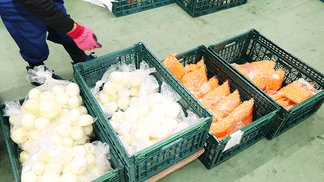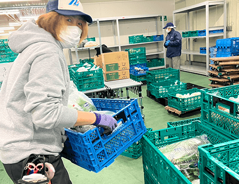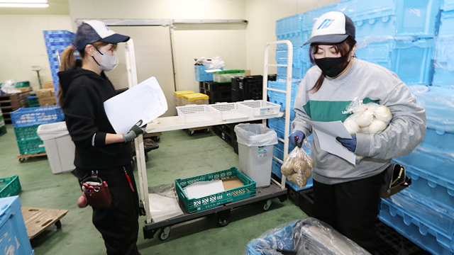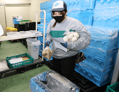 冷蔵庫内で、食品や野菜などを配送先毎に仕分けしていくのが私達のお仕事。